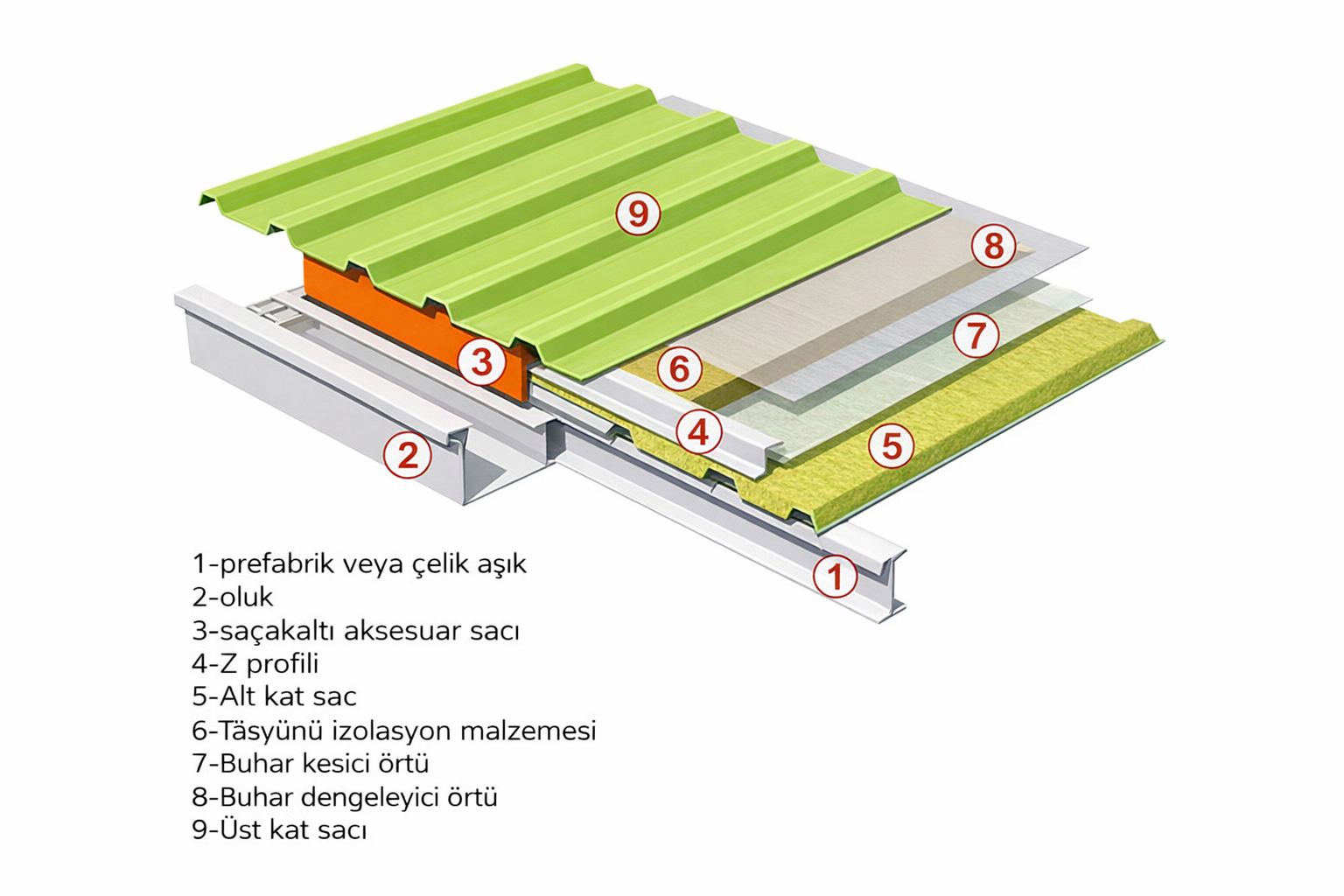 Çift Kat Yerinde Uygulama Çatı Sistemi, özellikle sanayi yapıları, depolar, fabrikalar ve geniş açıklıklı binalarda tercih edilen, yüksek yalıtım ve uzun ömür sunan modern bir çatı çözümüdür. Bu sistemde çatı kaplama katmanları sahada uygulanır ve ihtiyaca göre özel olarak tasarlanır.