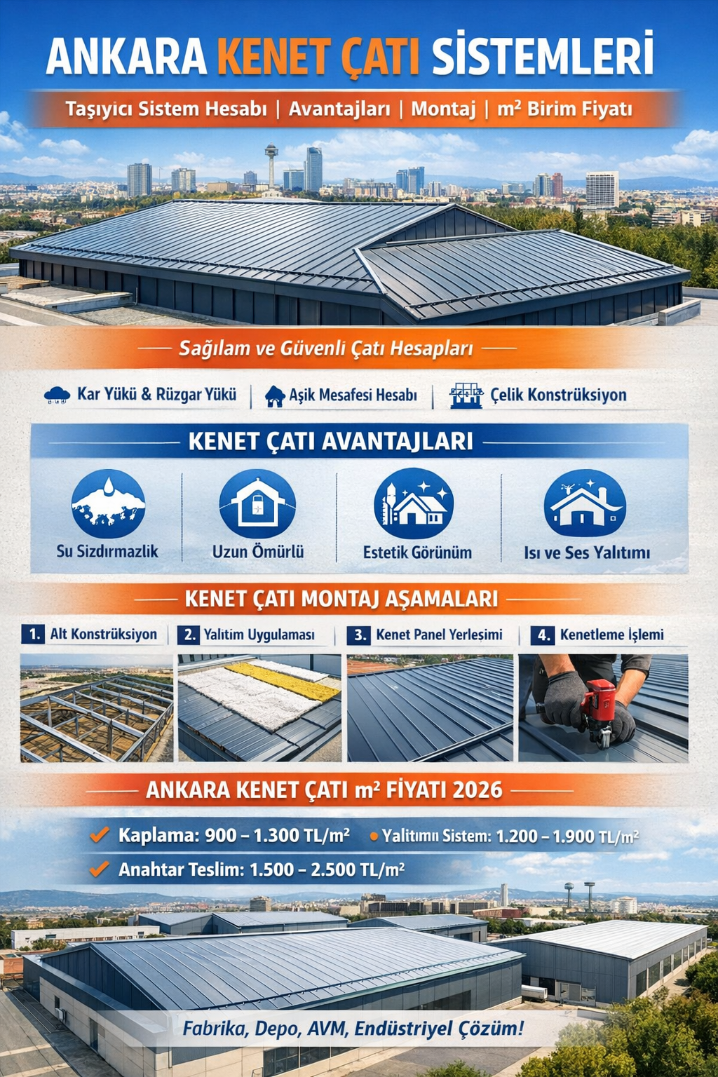Ankara gibi karasal iklime sahip şehirlerde; yazın yüksek sıcaklık farkları, kışın kar yükü ve don olayları çatı sistemlerinde dayanıklılığı zorunlu hale getirir. Bu nedenle Ankara kenet çatı uygulamaları, yüksek mukavemetli taşıyıcı sistem ve doğru mühendislik hesabı ile yapılmalıdır.