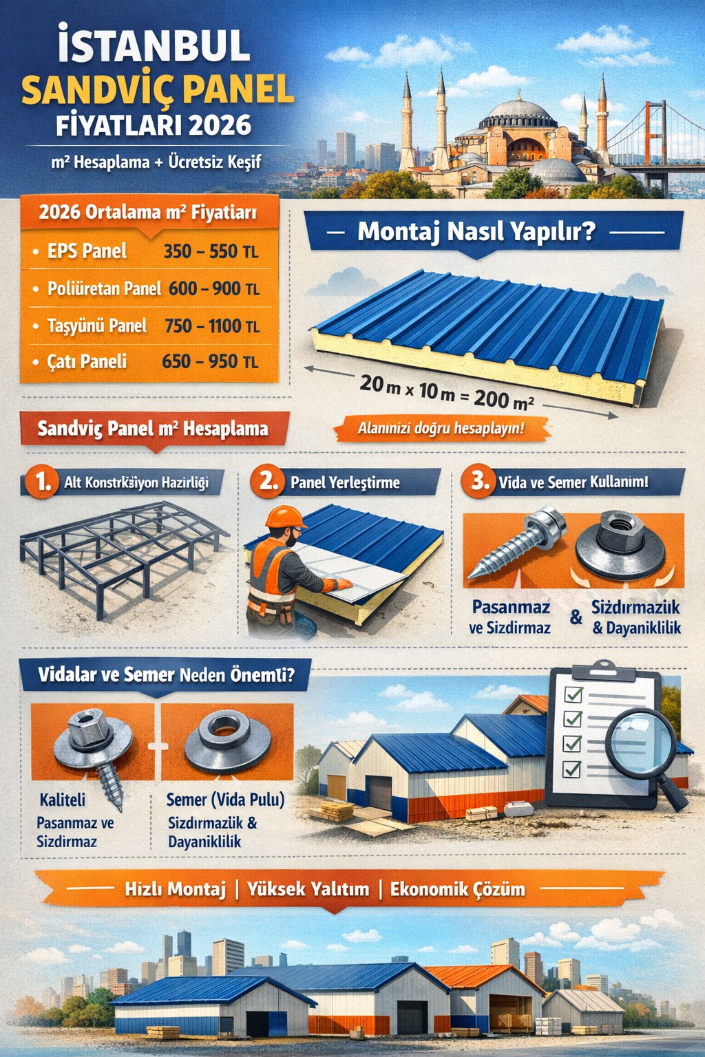 2026 yılında sandviç panel fiyatları; panel kalınlığı, kullanılan yalıtım malzemesi, montaj sistemi ve proje büyüklüğüne göre değişiklik göstermektedir. Bu yazıda İstanbul sandviç panel fiyatları, m² hesaplama yöntemleri, montaj aşamaları, vidanın ve semerin önemi gibi konuları detaylı şekilde ele alacağız.