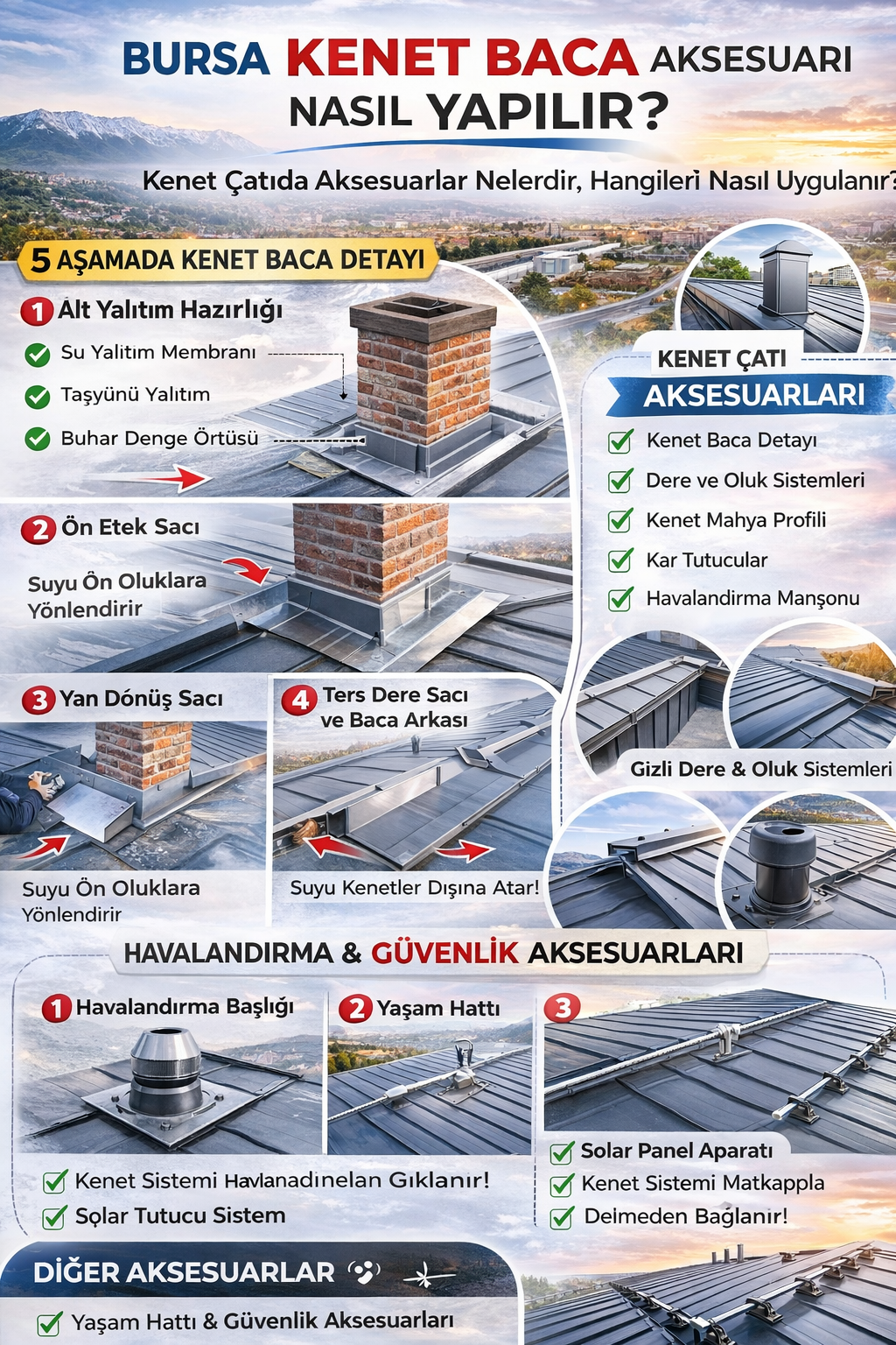 Bursa kenet çatı sistemlerinde aksesuar uygulaması, sistemin en kritik aşamasıdır. Özellikle baca dipleri, dere birleşimleri ve parapet dönüşleri uzmanlık gerektirir.