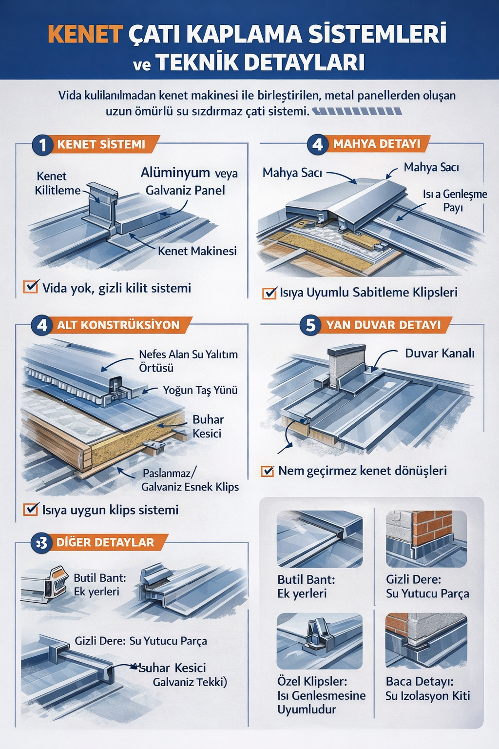 Genellikle galvaniz sac, alüminyum veya titanyum çinko malzemeden üretilen kenet paneller; düşük eğimli ve geniş açıklıklı çatılarda güvenle uygulanabilir. Isı genleşmesine uyumlu sabitleme klipsleri sayesinde çatıda deformasyon oluşmaz. Endüstriyel tesisler, fabrikalar, villalar, AVM’ler ve idari binalarda yaygın olarak tercih edilir.