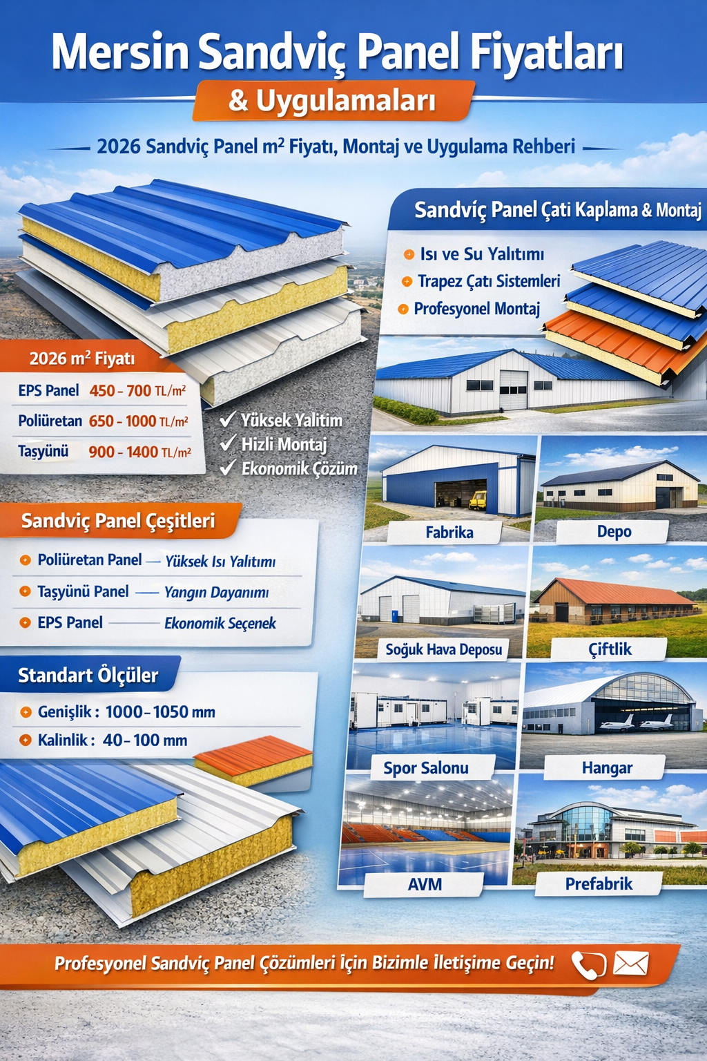 Bu yazıda Mersin sandviç panel fiyatları, sandviç panel m² fiyatı, sandviç panel çatı kaplama, sandviç panel montajı, sandviç panel ölçüleri ve sandviç panel çeşitleri hakkında detaylı bilgiler bulabilirsiniz. Ayrıca yazının sonunda 8 farklı sandviç panel uygulama alanını da inceleyebilirsiniz.