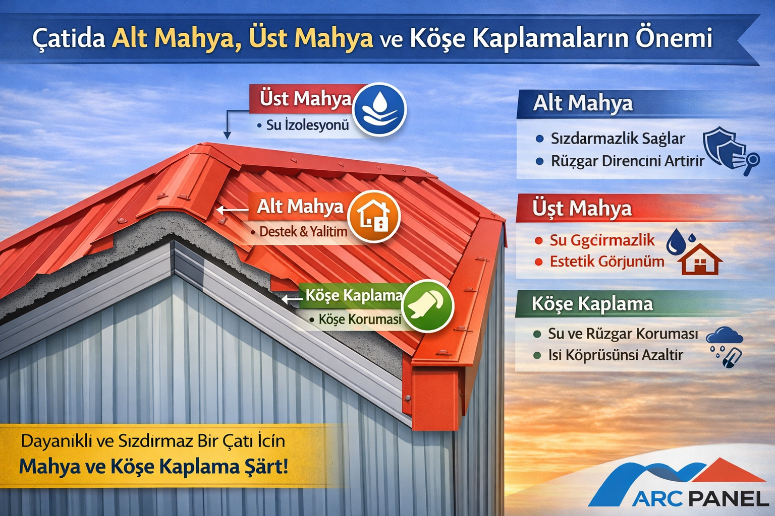Doğru mahya ve köşe kaplama kullanılmadığında çatıdan su alma, rüzgar kaldırması, ısı kaybı ve panel deformasyonu gibi ciddi sorunlar ortaya çıkabilir.